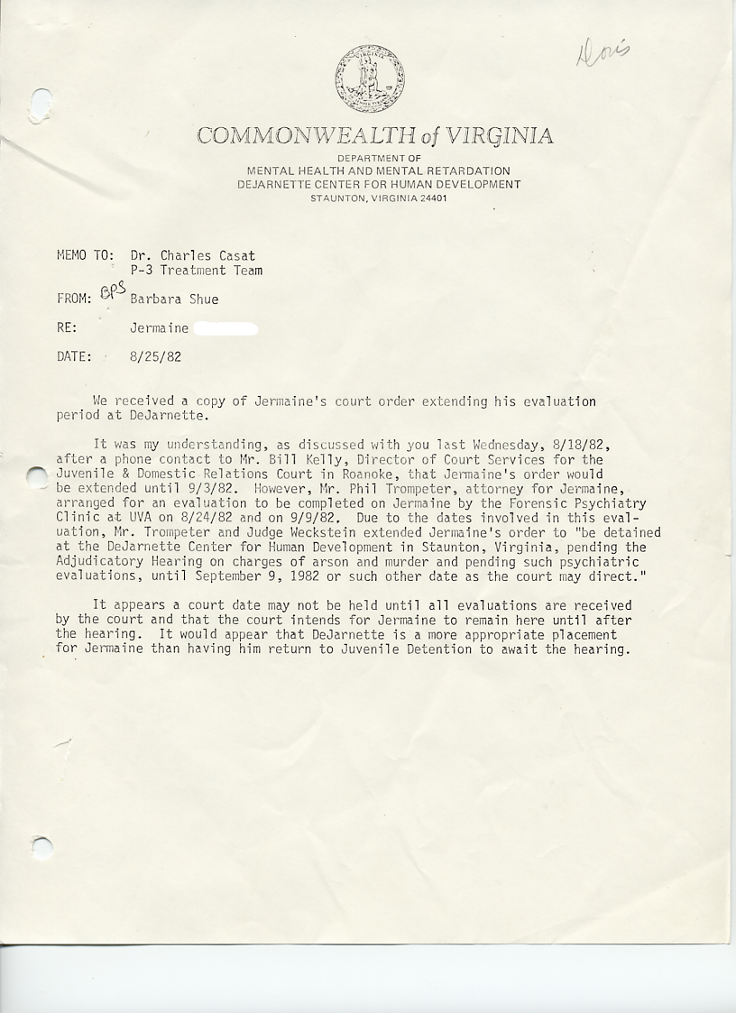 Jermaine was one of the children attending the DeJarnette Children's Center in the 1980s. The following information is based on official records and staff notes from 1982. The first document is dated August 25, 1982 and it is regarding a court order and psychiatric evaluation for Jermaine. I was surprised that the court order was related to the charges of arson and murder! Maybe the murder was the result of the arson. Apparantly, Jermaine had been placed in Juvenile Detention, but it was thought that the DeJarnette Center would be more appropriate for him to await his hearing. The graphic to the right is the document from the Commonwealth of Virginia regarding Jermaine's court order and placement.