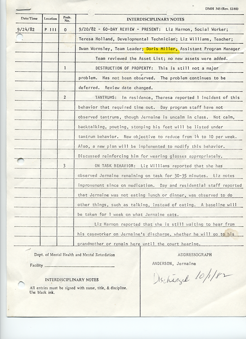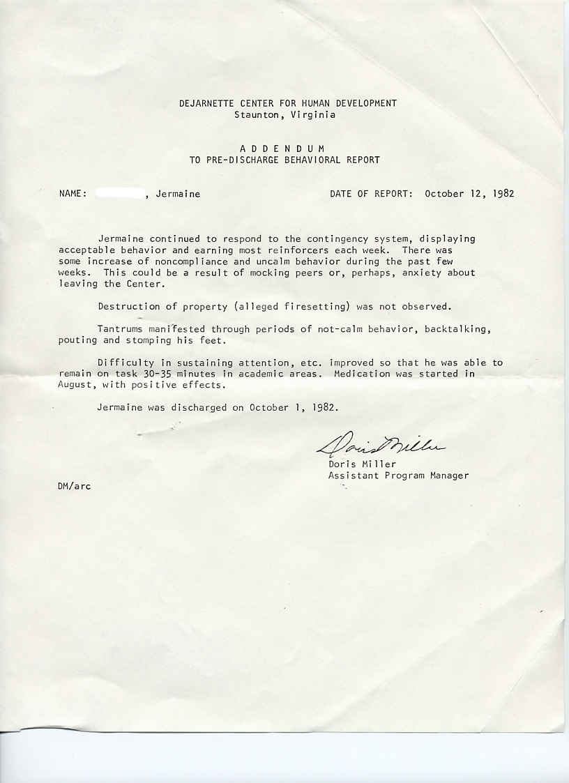 There is another document regarding Jermaine's discharge from the DeJarnette Center and this was an "Addendum To Pre-Discharge Behavioral Report" dated October 12, 1982. It states that Jermaine was making good progress in showing acceptable behavior, although there was a period of noncompliance that was thought to be caused by anxiety about leaving the DeJarnette Center or from "mocking peers." Jermaine did not have any instances of arson or property destruction during this period and had better concentration. He was discharged from DeJarnette on October 1, 1982. The graphic below is the Addendum To Pre-Discharge Behavioral Report. ![]() The graphic below shows a handwritten note from a worker at the DeJarnette Children's Center. It is regarding reading a story to Jermaine and one dip per story. It also says that another child at DeJarnette, Jimmy, should be reminded to return a book to the school's library called, The Day Daddy Stayed Home. ![]() | ||