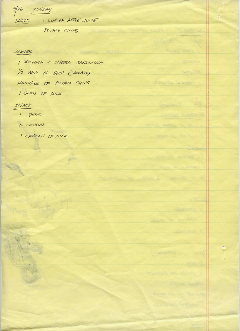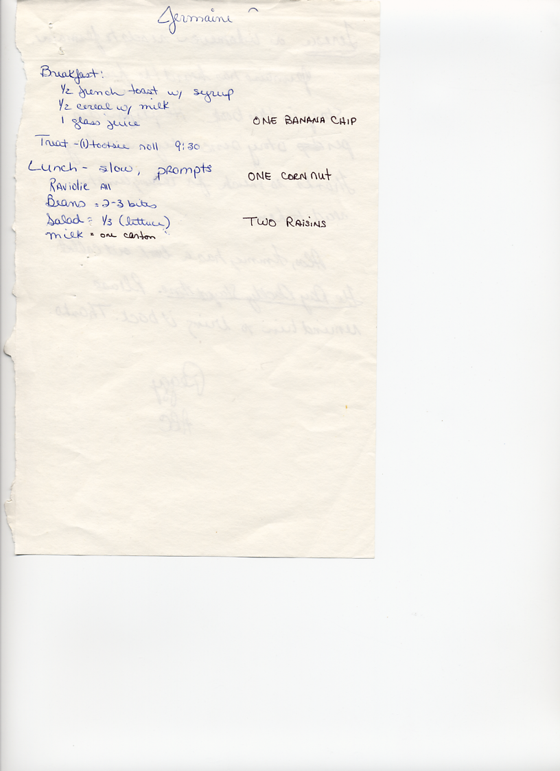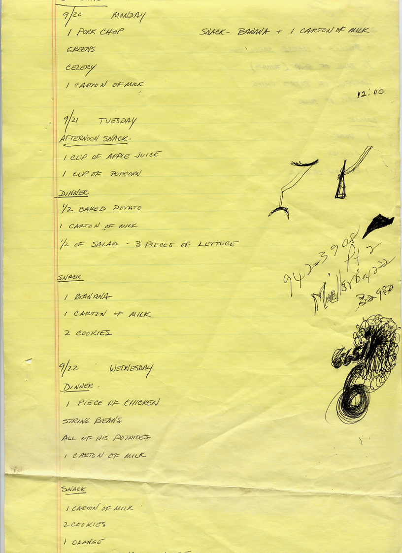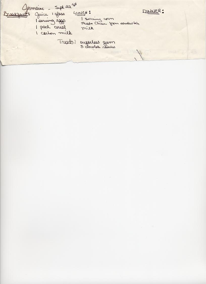 The graphic to the left shows Jermaine's 60-Day Review. According to this document, Jermaine was working on problems that included temper tantrums and destruction of property. The problem with destruction of property had improved, but Jermaine was sent to time-out for having a tantrum. This behavior was described as pouting, back-talking, feet stomping, and hyperactivity. The 60-Day Review also stated that Jermaine had shown improvement in his concentration and was able to spend more time at tasks since being put on medication. The medication was not mentioned, but it sounds as if it might have been Ritalin. Ritalin was prescribed a lot in the 1980s to treat hyperactivity or Attention Deficit Disorder (ADD) in childrten. It was also noted in this report that Jermaine was not eating his lunch or dinner and staff were going to start monitoring this. One of the side effects of Ritalin is loss of appetite. The graphics below show handwritten notes by staff documenting Jermaine's food intake during some days in September 1982.